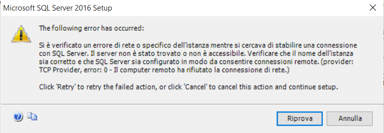 TCP Provider, error: 0 - Il computer remoto ha rifiutato la connessione di rete. Microsoft SQL Server, Error: 1225” questo semplice e significativo messaggio ci avvisa che il Server SQL, col quale stiamo cercando di collergarci, non risponde. Ci possono essere molteplici motivi di questo “disservizio”, in questo articolo viene illustrata una delle cause e la sua risoluzione.