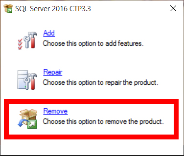 L’unica soluzione fattibile a questo punto risulta essere disinstallare e reinstallare SQL Server 2016. Per la disinstallazione è necessario andare in Pannello di Controllo, Programmi e Funzionalità, cercare l’applicazione Microsoft SQL Server 2016 e prodecede con la disinstallazione