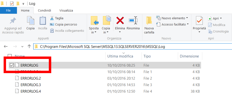 Ahimè la cosa non è così immediata, otteniamo il codice di errore 17051 con l’invito di contattare il fornitore del servizio … quindi ce la dobbiamo sbrogliare da soli. Fortunatamente è possibile saperne di più di quanto accaduto andando a vedere il file di LOG che in questo caso è presente in C:\Program Files\Microsoft SQL Server\MSSQL13.SQLSERVER2016\MSSQL\Log ovvero C:\Program Files\Microsoft SQL Server\.\MSSQL\Log