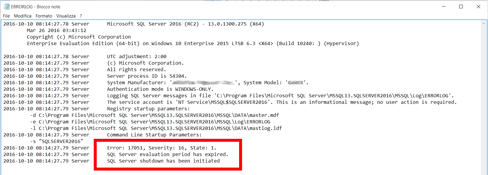 Notiamo subito il riferimento all’errore “Error: 17051, Severity: 16, State 1”, scoprendo così il vero motivo del mancato avvio di SQL Server 2016: il periodo di valutazione è scaduto.