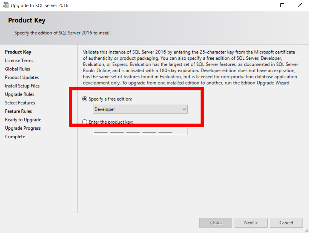 Confermiamo il fatto che stiamo installando la versione Developer: SQL Server 2016 serve per effettuare sviluppo e test (non per ambienti di produzione o per usi con dati di produzione)