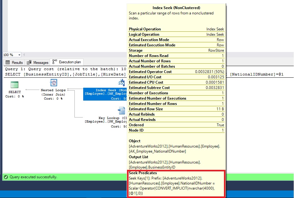 Ad una prima occhiata non sembrerebbe presentare nulla di particolare. Ma in realtà esplorando i dettagli dell’operazione “Index Seek” notiamo che il QP ha applicato la funzione CONVERT_IMPLICIT  alla nostra costante riscrivendo di fatto il Seek Predicate. Ciò è dovuto all’utilizzo di un qualificatore di stringa non coerente con il tipo dato della colonna “NationalIDNumber” (NVARCHAR(15)). In particolare abbiamo utilizzato una stringa delimitata da apici singoli (‘112457891’) la quale viene identificata dal sistema come una stringa non-Unicode, mentre avremmo dovuto utilizzare una stringa delimitata da apici preceduti da una lettera N (maiuscola) (N'112457891’) la quale indica invece una stringa di caratteri Unicode e quindi in accordo con il tipo dato della colonna.