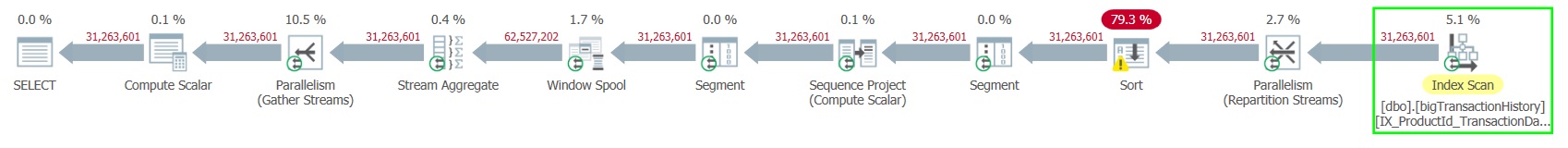 L’operazione di ordinamento rappresenta l’operazione più onerosa nel piano di esecuzione ed è anche segnalata con il simbolo di warning (Sort Warning) perché utilizza il database di sistema tempdb (spill on tempdb) per l’operazione di ordinamento. I dati vengono successivamente partizionati per ProductID (Segment) e aggregati (Stream Aggregate) per calcolare il running-total sulla colonna Quantity.