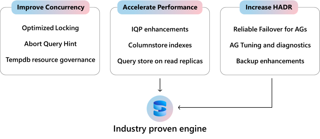 La versione 2025 di SQL Server ha segnato diversi investimenti nell’Engine, la figura seguente (presentata a Build 2025) illustra le aree di innovazione nelle quali si sono concentrati gli investimenti.