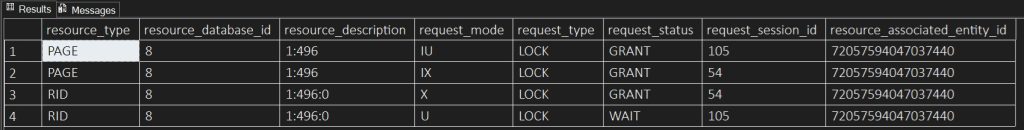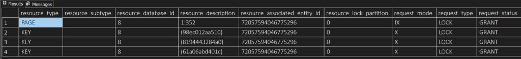 La stessa operazione, eseguita sulla stessa tabella ma in un database con Optimized Locking disabilitato, evidenzia i lock di tipo exclusive (X) sulle righe e il lock di tipo intent exclusive (IX) sulla pagina che contiene le righe; questi lock rimarranno al loro posto fino al termine della transazione come illustra la figura seguente.
