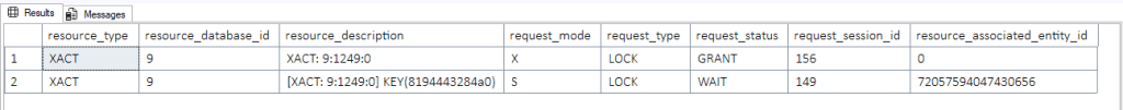 Si osservi che l’identificatore (8194443284a0) è lo stesso citato nella colonna resource_description della DMV sys.dm_tran_locks. La sessione 2, quella con SPID 149, sta aspettando sul Transaction ID che detiene la riga identificata dal lock hash (8194443284a0), la prima delle due righe modificate.