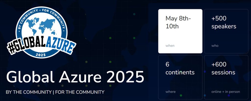 Nei giorni 8, 9 e 10 maggio 2025, le community di tutto il mondo si riuniranno insieme per l’edizione 2025 di Global Azure. In ogni evento ci saranno sessioni su Microsoft Azure, il risultato sarà che migliaia di persone impareranno a conoscere la piattaforma cloud di Microsoft e si uniranno online sotto l’hashtag #GlobalAzure!